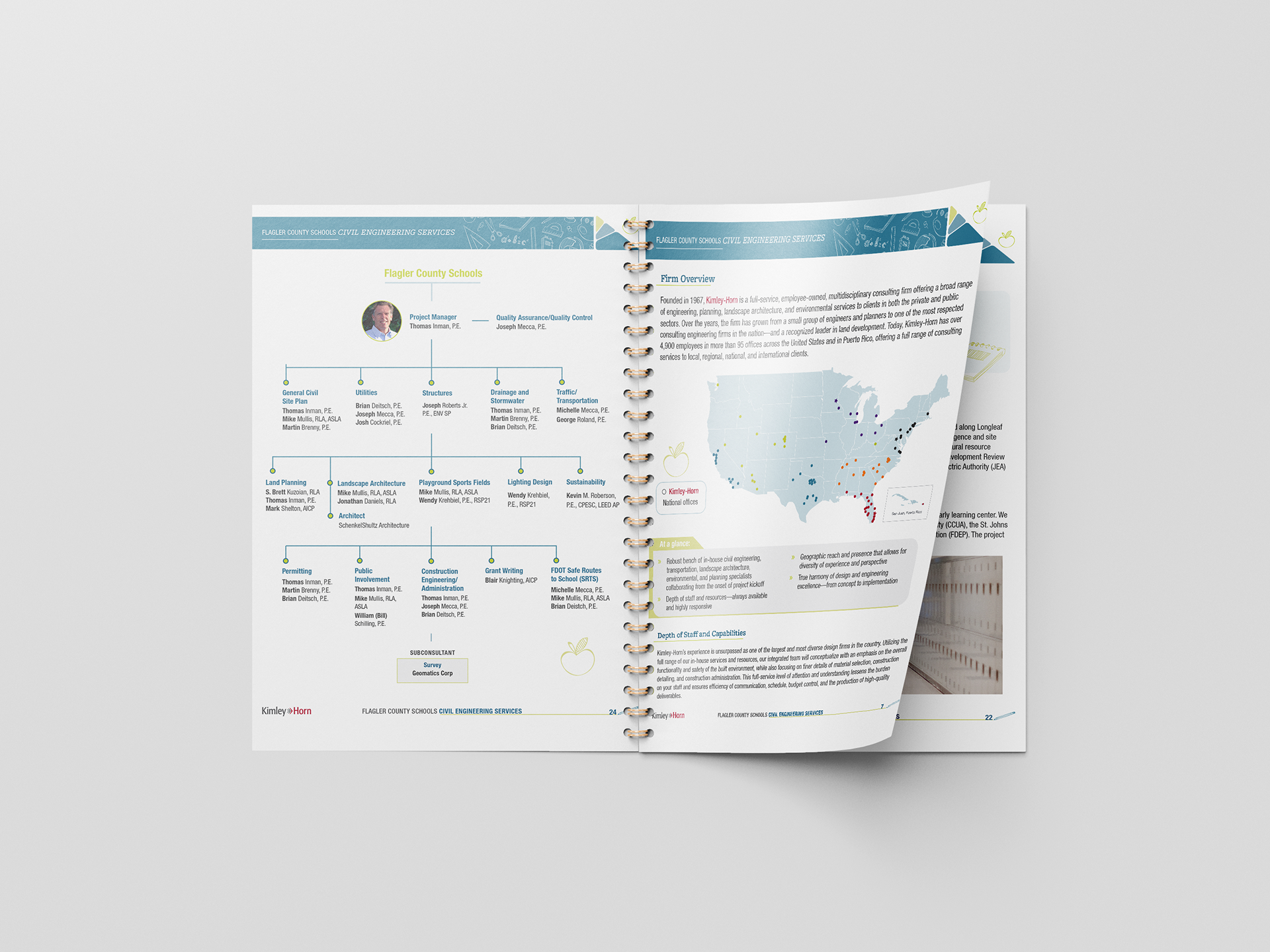Full Kimley-Horn marketing proposal for Flager county schools. The design is consistent with the brand guidelines and effectively showcases the firm's department-specific related services for its future clients.