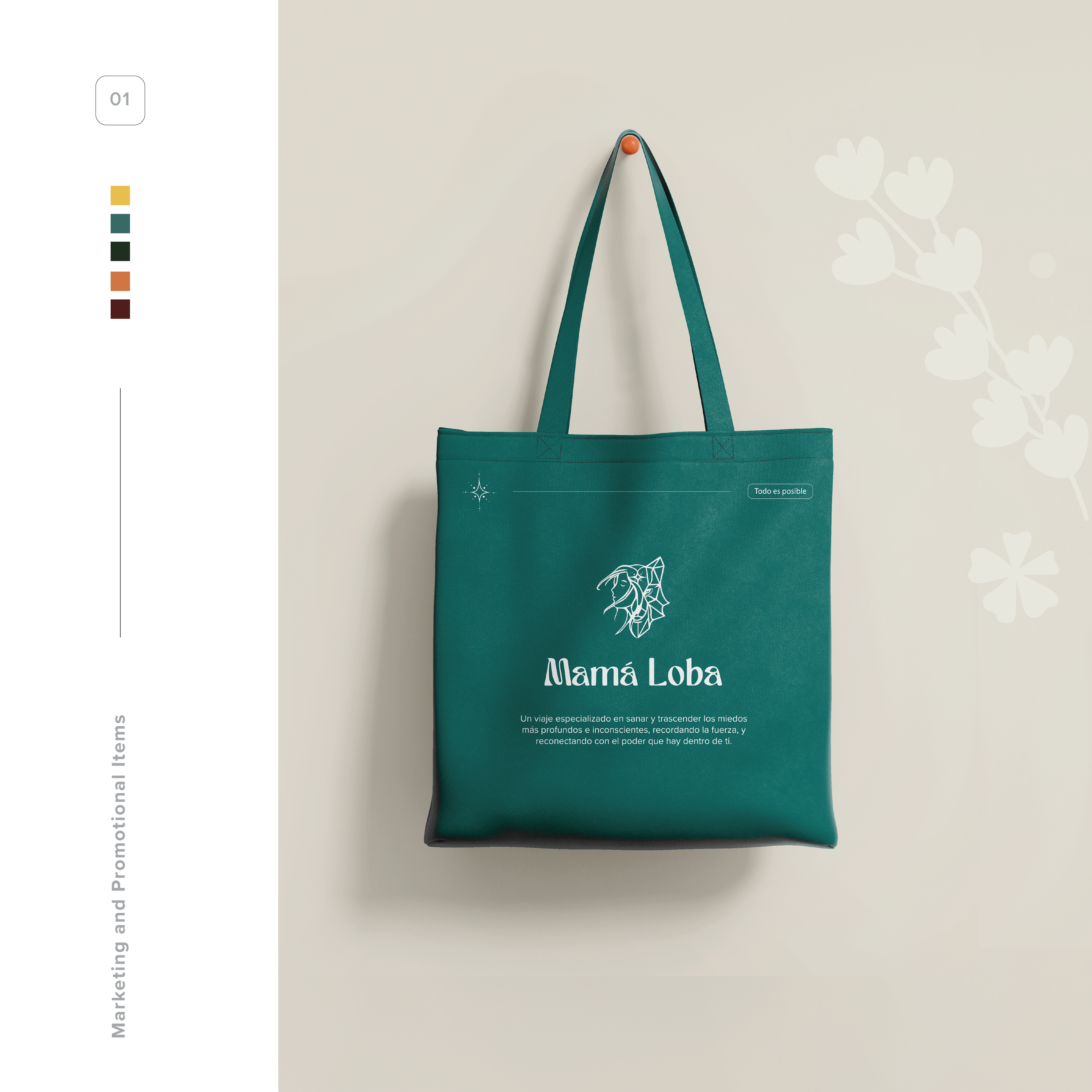 Logo and promotional items for Mama Loba, a company that facilitates reconnection with personal power through its mentorship and services. The logo effectively captures the brand's essence through its logomark, where the face of a woman and a wolf merge as one, symbolizing the harmonious blend of personal power, instinct, and transformation. The typography complements this imagery, with its clean and bold design reflecting the strength, guidance, and nurturing qualities of the brand’s services. Together, the elements create a cohesive visual identity that aligns perfectly with the mission of empowering individuals to reconnect with their inner selves.